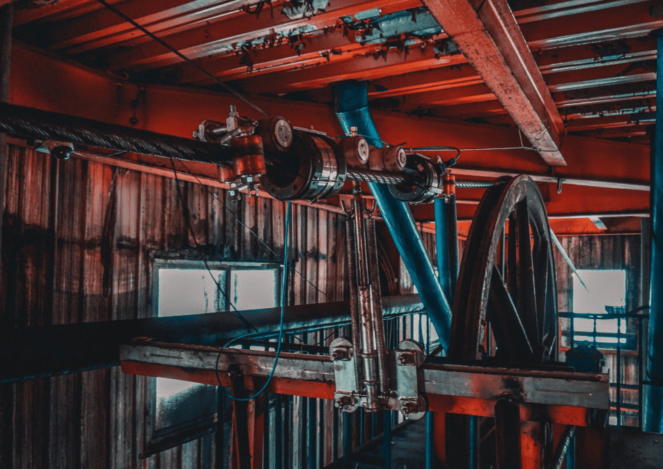 隨后我們爬上100多米高副井提升機天輪機房