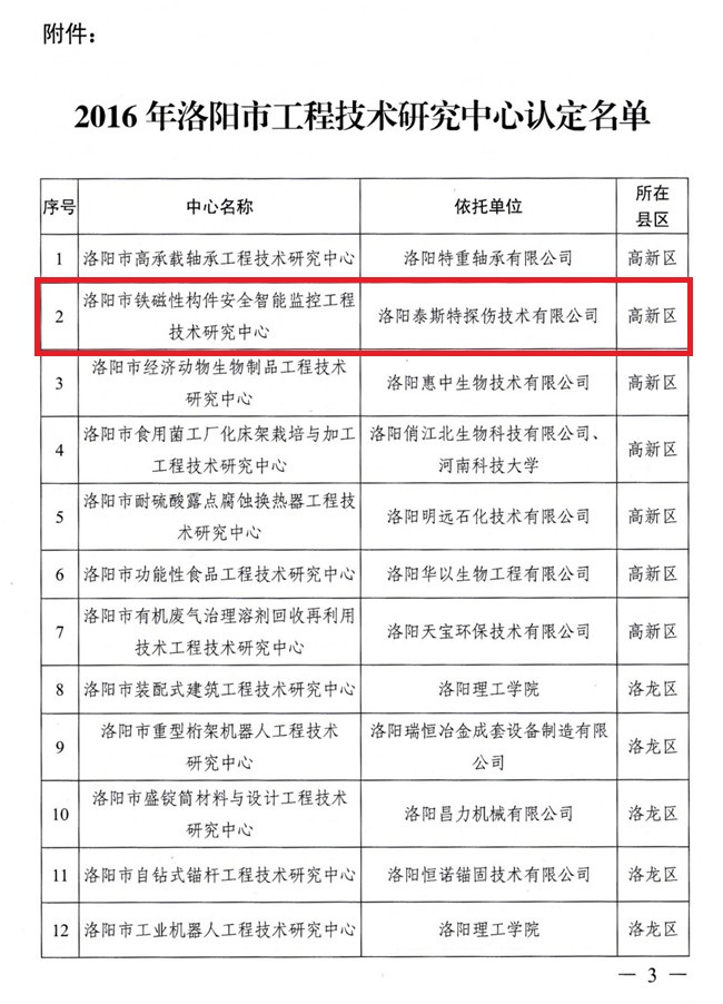 根據(jù)《洛陽市工程技術(shù)研究中心管理辦法》(洛市科【2006】95號(hào))規(guī)定,經(jīng)組織申報(bào)、初審、現(xiàn)場(chǎng)考察、會(huì)議評(píng)審等評(píng)審程序,洛陽泰斯探傷技術(shù)有限公司被認(rèn)定為洛陽市鐵磁性構(gòu)件安智能監(jiān)控工程技術(shù)研究中心。